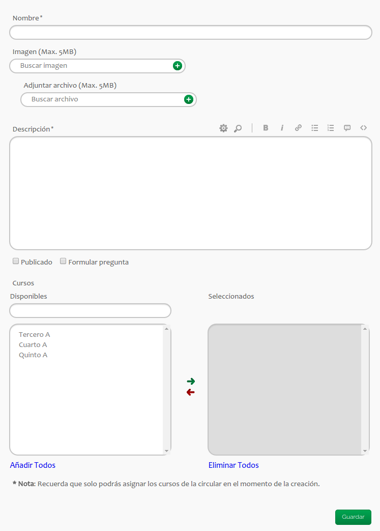 La circular tendrá un nombre, una imagen adjunta y un archivo descargable, una descripción, una pregunta dirigida a los padres de familia, y a los cursos a los cuales se va a asignar. Además de lo anterior, el usuario podrá publicar la circular, en la que los usuarios para los que va dirigida podrán visualizarla. La asignación a cursos solo puede ser realizada una vez, luego de la creación, se podrá visualizar a que cursos va dirigida pero no se podrá modificar. Si la circular aún no ha sido publicada, puede ser editada.