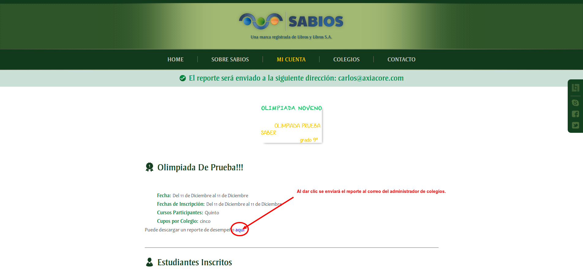 El único que podrá obtener el reporte de las olimpiadas será el administrador de colegio, lo hace dirigiéndose a la página principal de la plataforma, al pasar el cursor por colegios, se mostrará la olimpiada que creó, luego deberá acceder a ella y dará clic en el botón “aquí” para descargar el reporte que será enviado al administrador de colegios, como lo muestra esta ilustración: